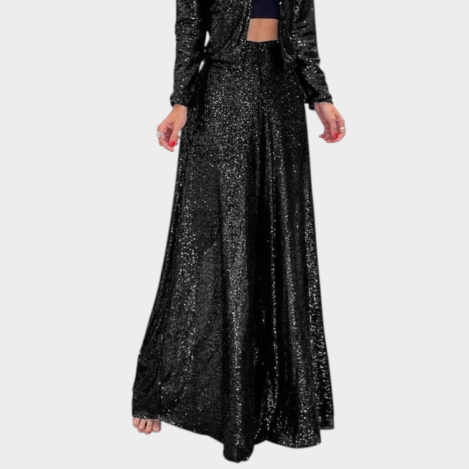 Designed to make an entrance, these statement wide-leg pants bring effortless glamour to any evening look. With a flowing silhouette and light-catching texture, they’re perfect for nights out, celebrations, and special occasions.